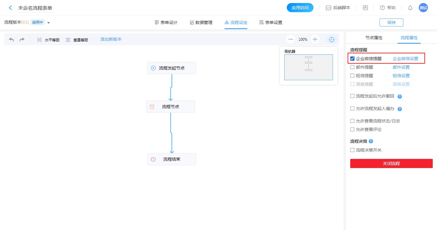 【流程设计】-【流程设定】-【流程属性】-【流程提醒】-【企业微信提醒,微信设置】