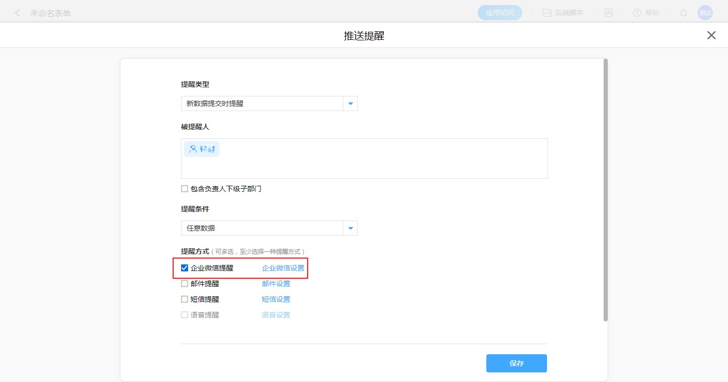 【应用管理】-【报表设计】-【定时提醒】 -【提醒方式】-【企业微信提醒,企业微信设置】