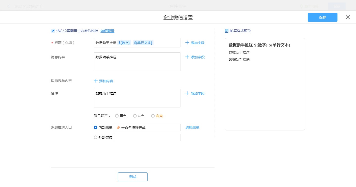 • 数据助手设置企业微信消息模板