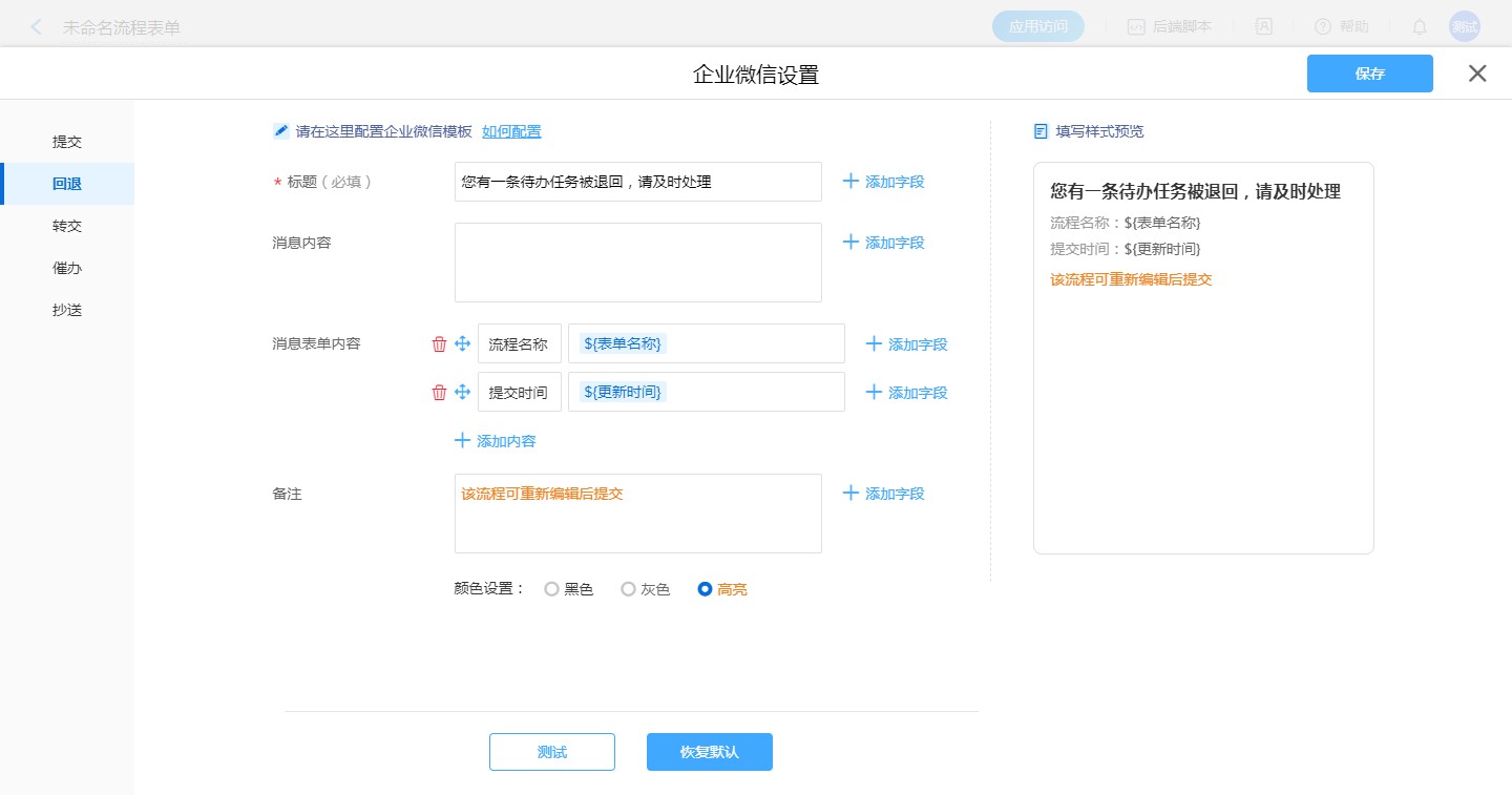 流程表单设置企业微信消息模板