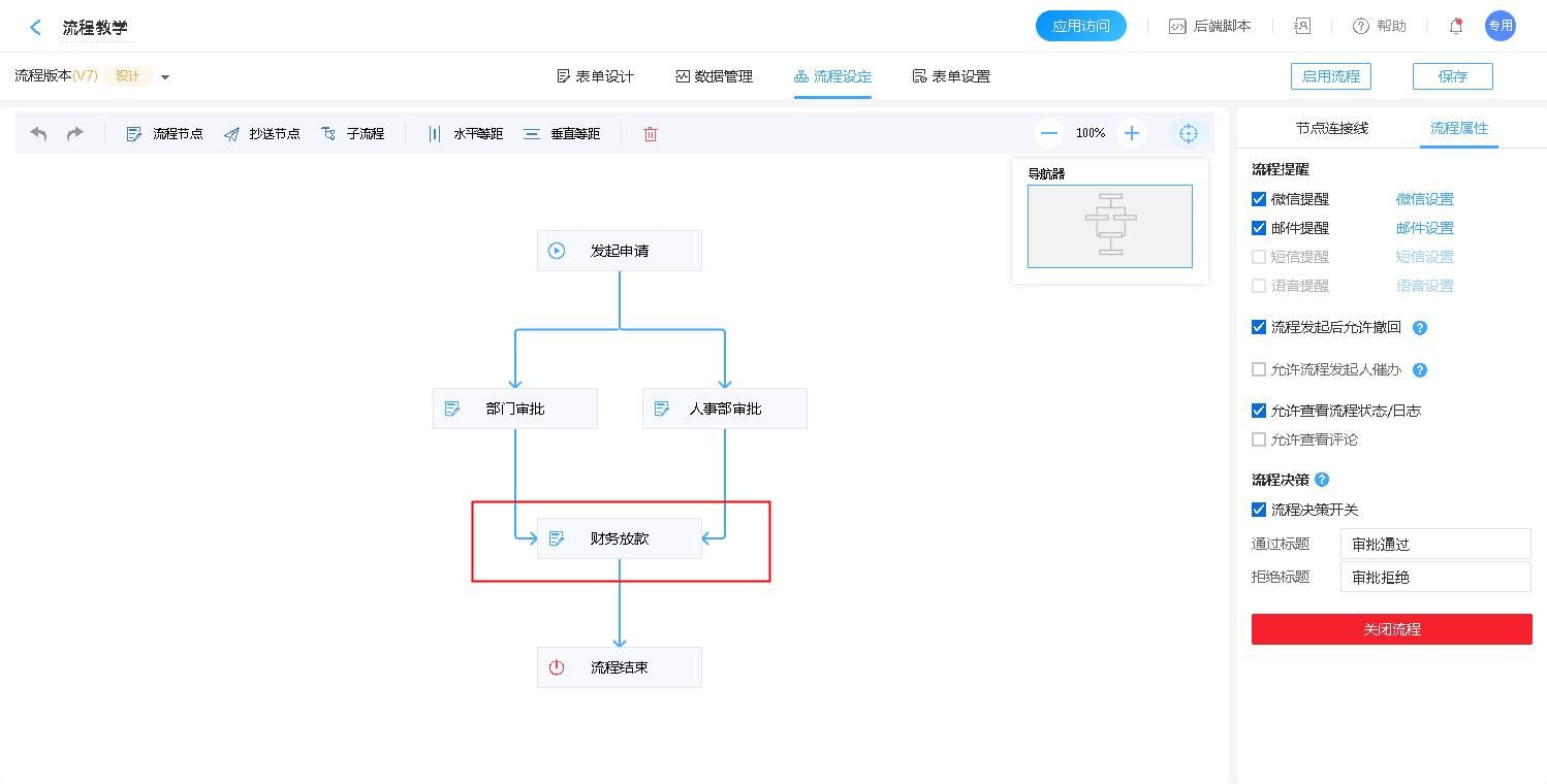 按照这个设定,我们就完成了流程的条件流转,满足金额小于500元的走部门审批环节,大于500元的走人事部审批环节。