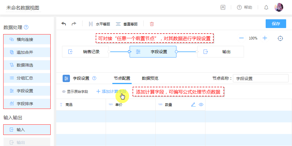 除了主要配置“公式字段”,还可以在此节点对字段重命名,隐藏显示,调整列的排序。