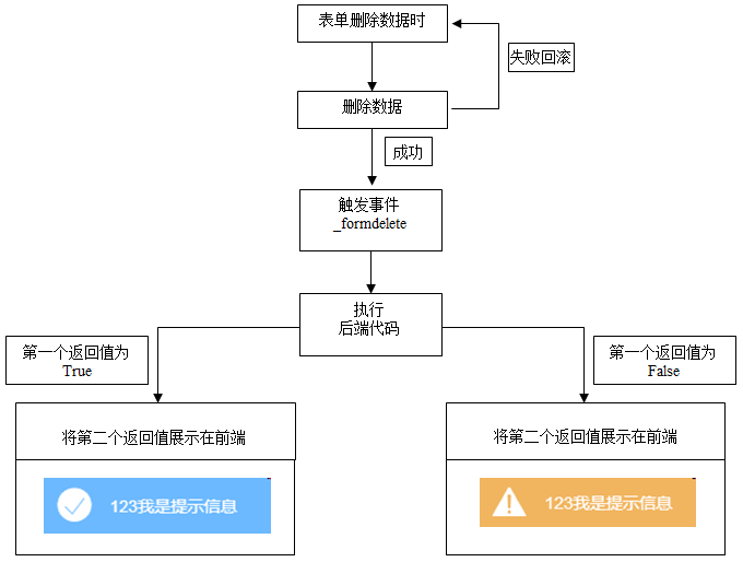 | 前置返回 | False:拦截删除操作 | 前端展示文本信息,为空无提示 |