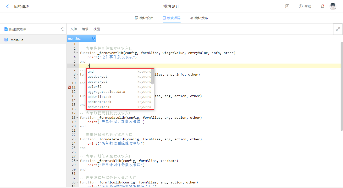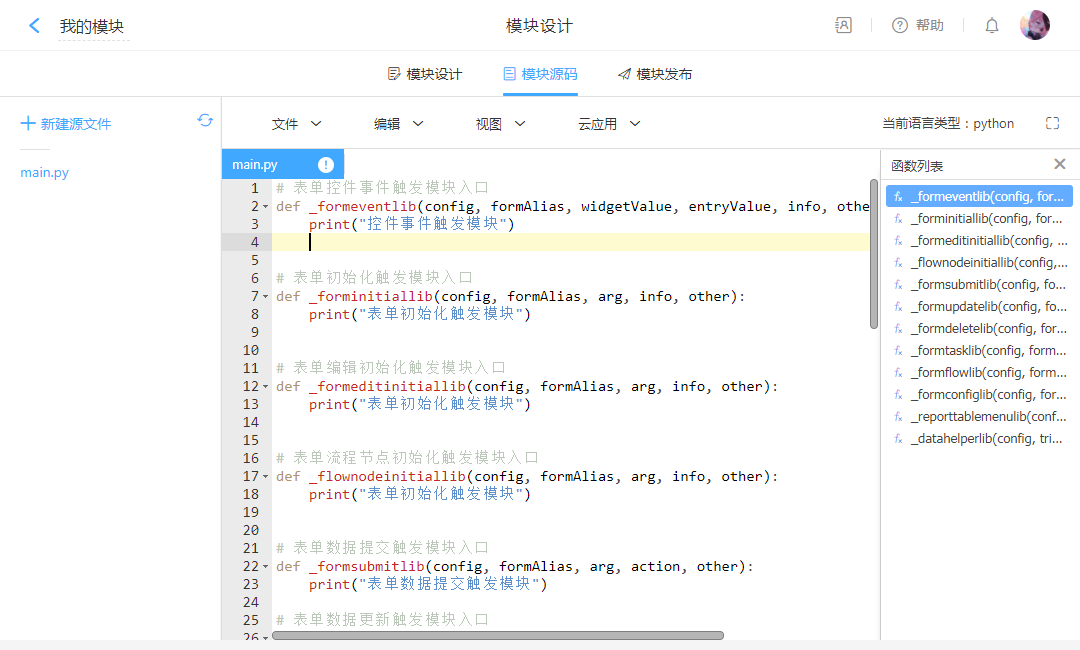 源文件.pypython源码文件而开发的,用户在编辑功能插件的代码.py文件时,官方提供了语法关键字亮色、输入的智能提示、代码自动补全、代码排版等等功能。因此在调试功能插件代码时,推荐大家使用在线编辑器。