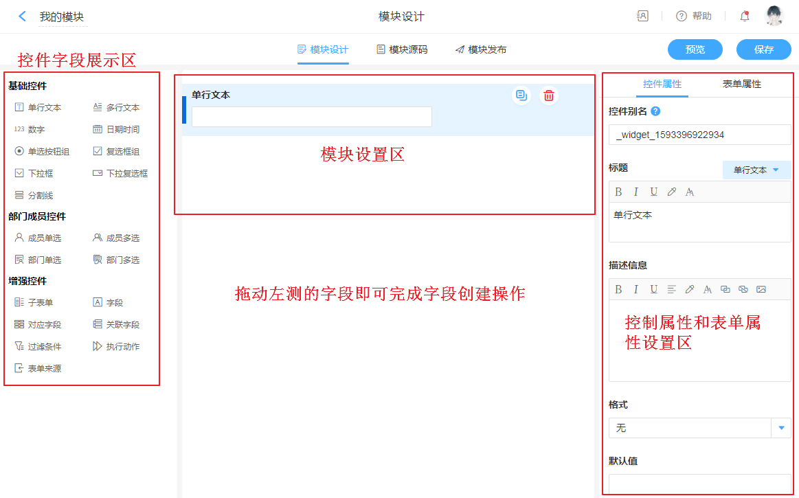 | 插件设计是添加相应的字段,设置标题等字段属性,把我们所需的字段拖拽完成后,一定不要忘记修改我们的表单名称。记得设置完成后要保存 |