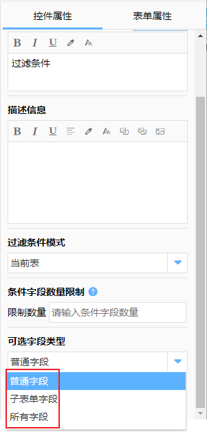 即设置可选字段可以选择哪些类型的字段,限制后只能选择与限制类型相符的字段。