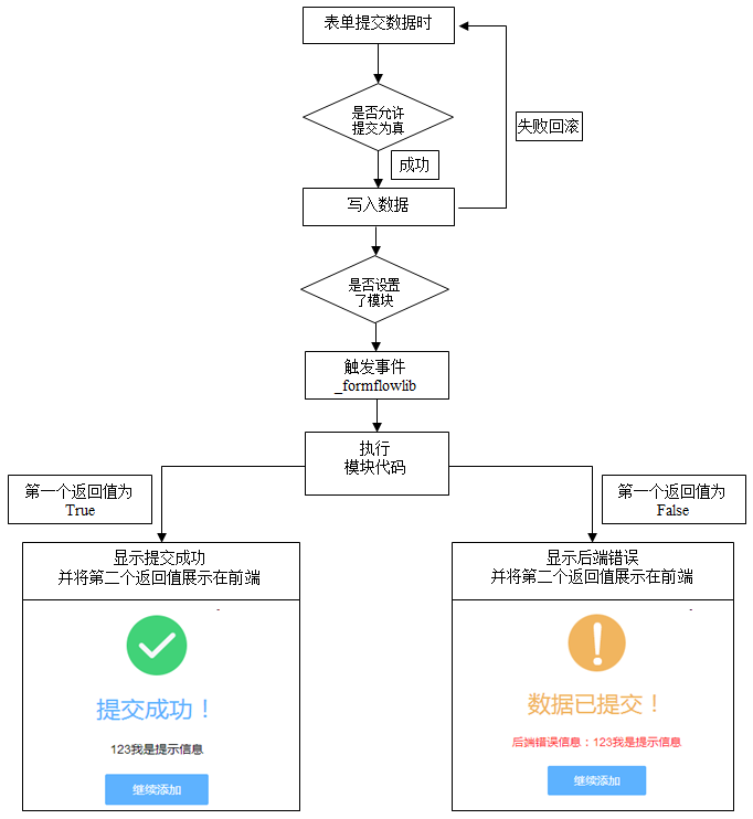 触发事件后,前端页面会将"当前表单别名","表单数据信息","数据提交类型"传给后端对应的云应用中的"_formflow"函数,然后执行"后端代码"并返回"返回结果"和"需要界面展示的数据"。