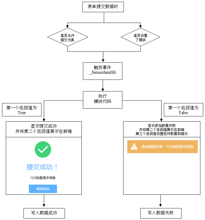 前置返回 False:拦截提交操作 前端展示文本信息,为空提示“提交成功” 根据json字符串,修改前端表单字段赋值与属性