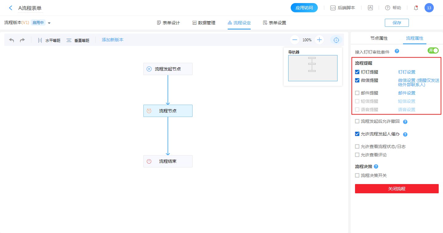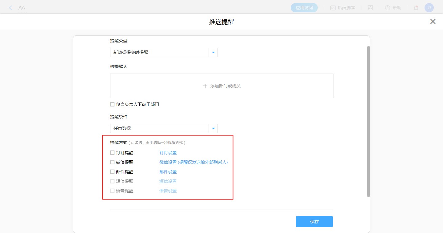 在设计表单-表单设置-推送提醒,提醒的方式可以勾选钉钉、邮件、短信、语音、微信(提醒仅发送给外部联系人)。