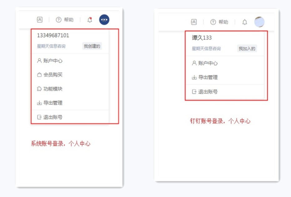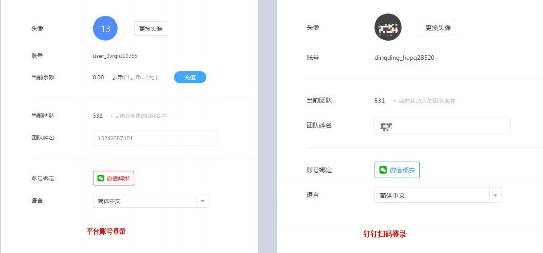 凌云账号和钉钉扫码登录系统,在个人中心的功能不一致。