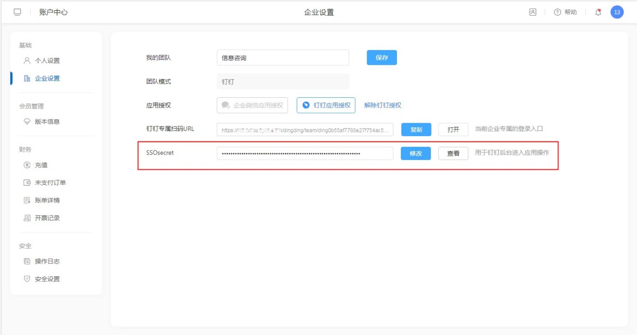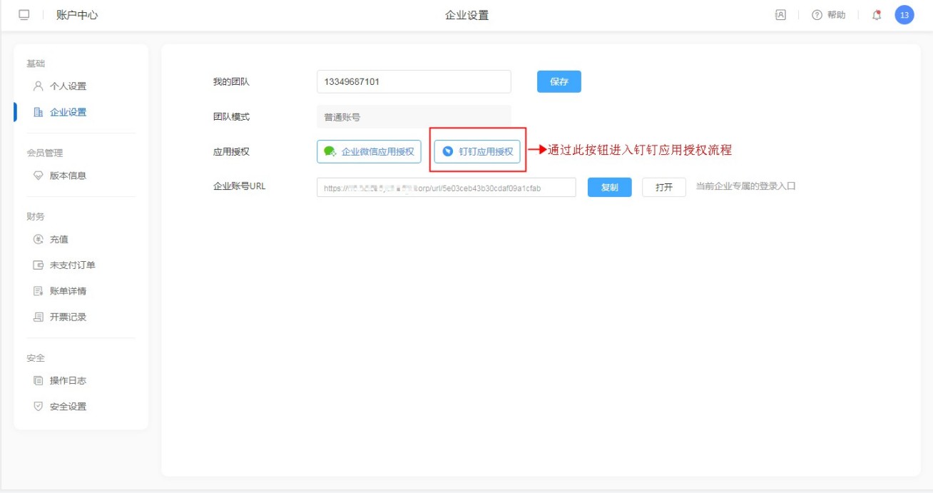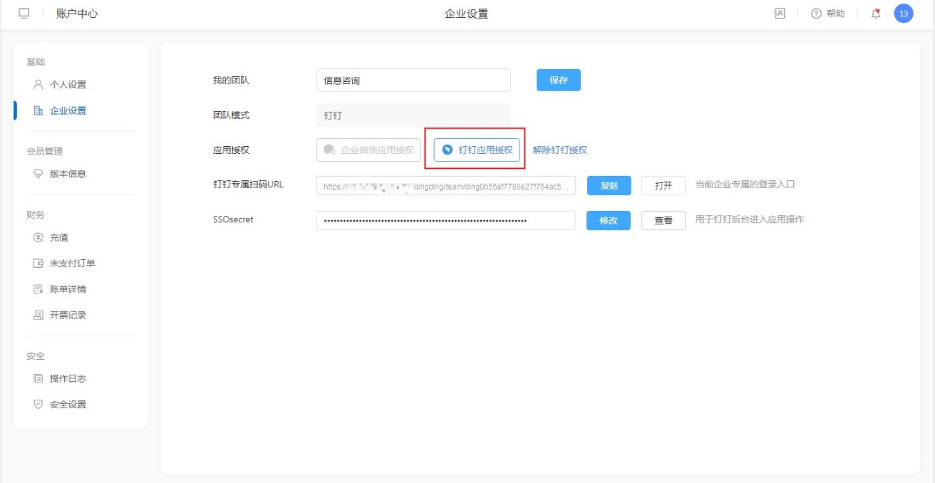 登录系统后,在【账号中心】-【企业设置】中可以找到钉钉专属扫码URL。