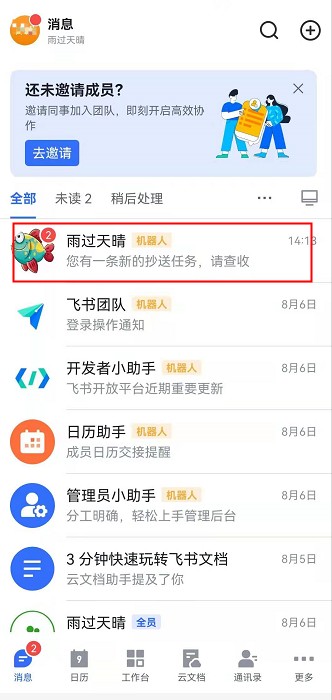 凌云账号和飞书绑定之后,流程和推送提醒,提醒方式会增加飞书提醒方式,其他功能不变。