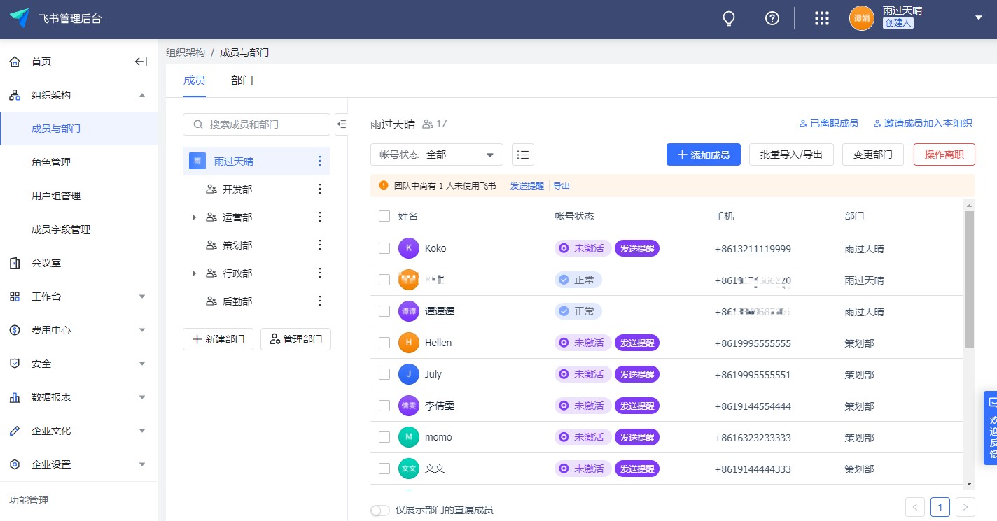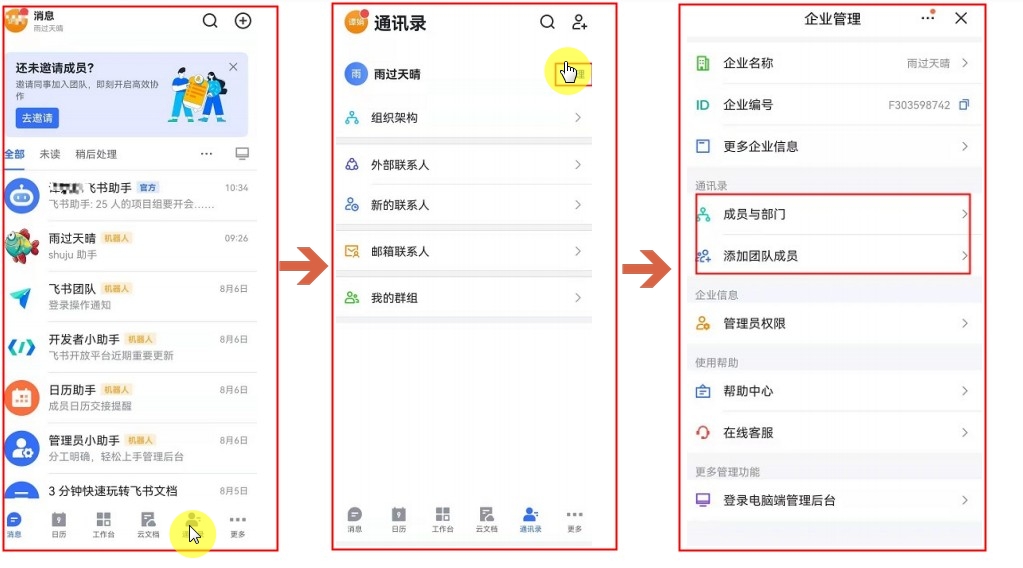 - 无法通过通讯录添加成员,需在飞书中添加成员后再同步到系统中。