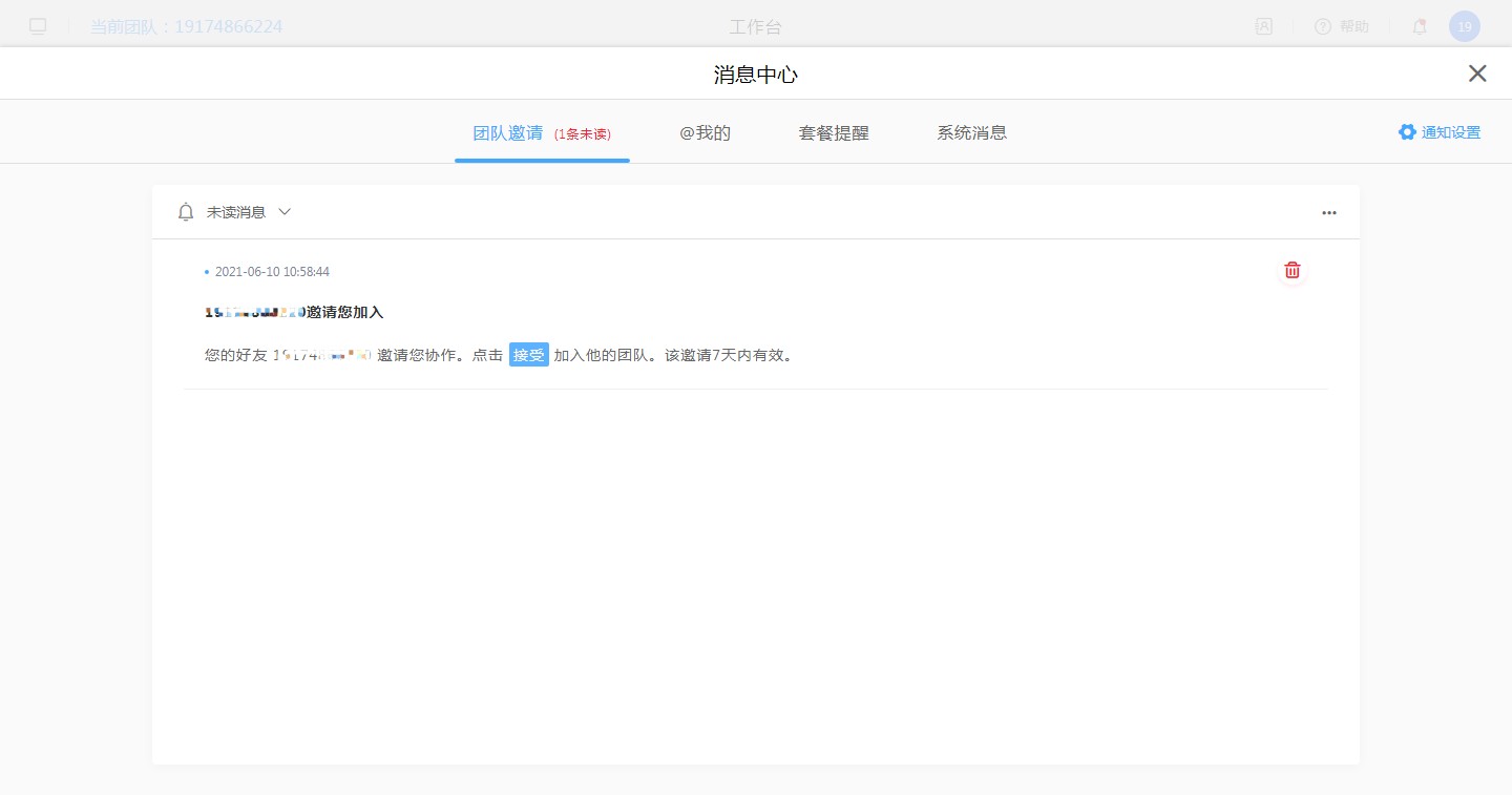 现在消息管理中的消息包括【系统消息】、【套餐提醒】、【团队邀请】、【@我的】这4种类型,不同的消息类型对应的不同的通知信息。