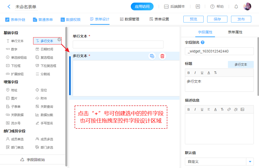 “多行文本”控件是表单基础控件当中唯一可以根据内容自动适合高度的控件,该属性更加方便大段内容填写与预览。