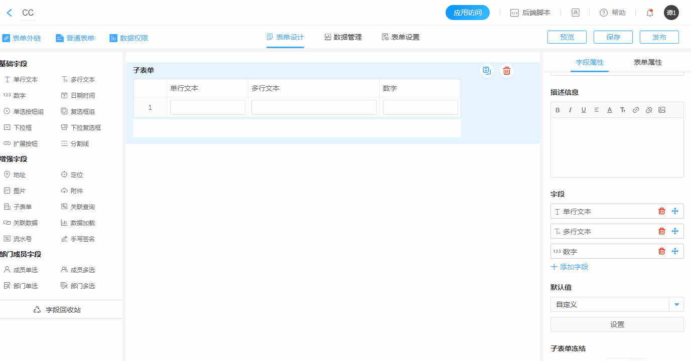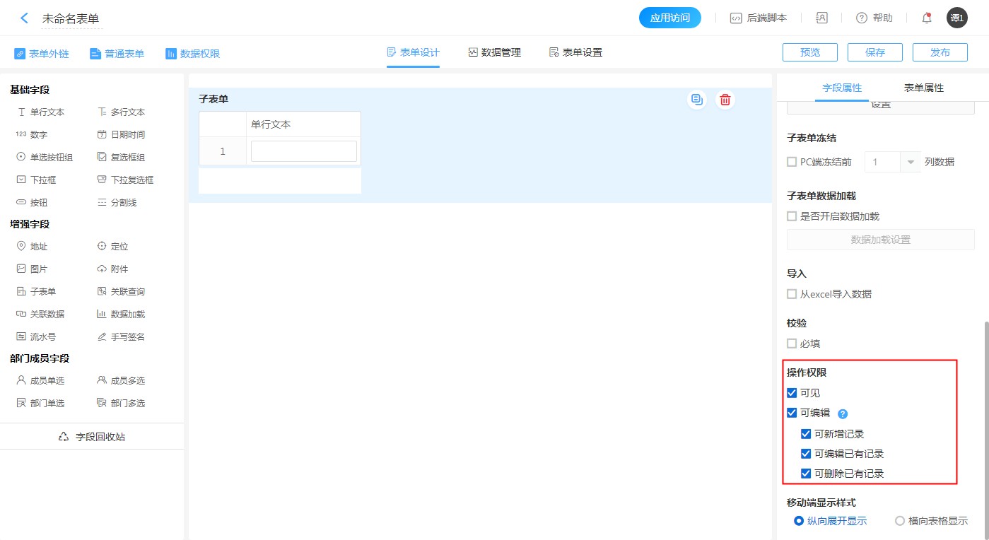 - 子表单内字段的控件属性设置,与普通字段一样,设置后记得保存。