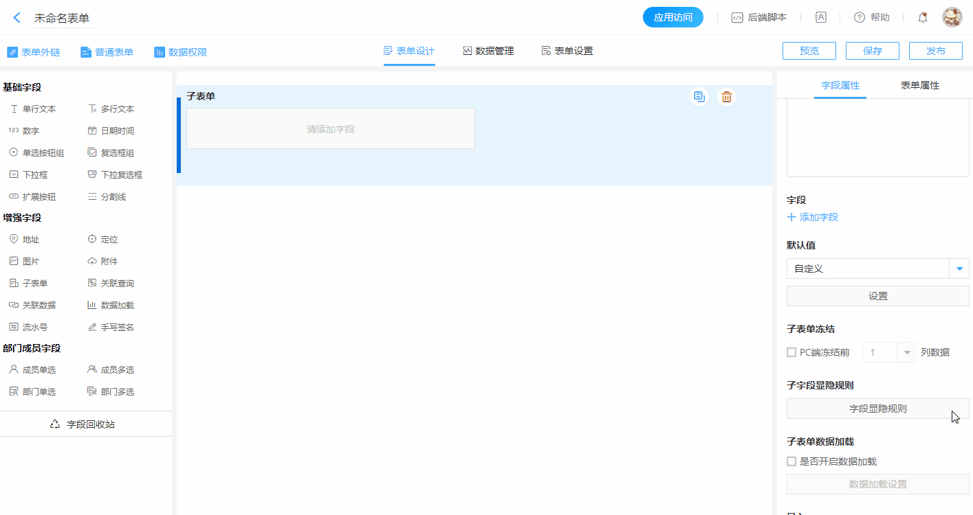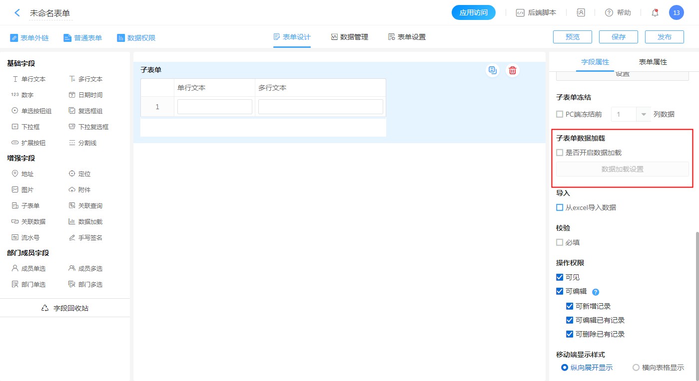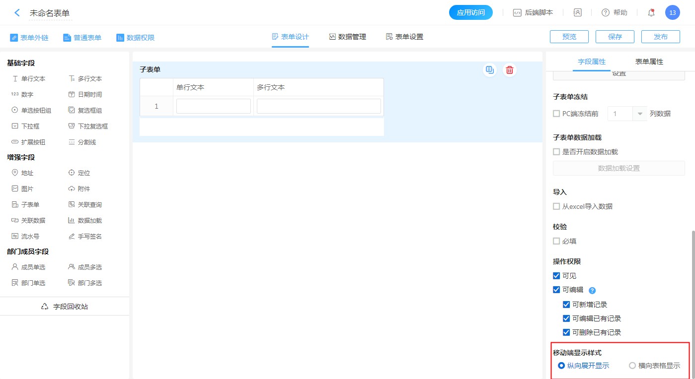 支持子表单内的字段添加、删除、排序。