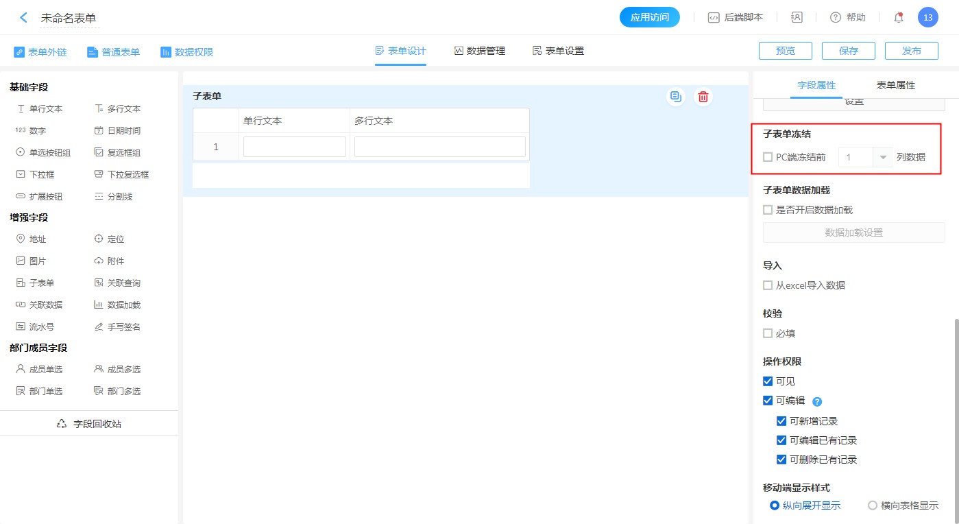 影响PC端,可以设置冻结子表单的前几列数据,当子表单字段过多时方便访问。