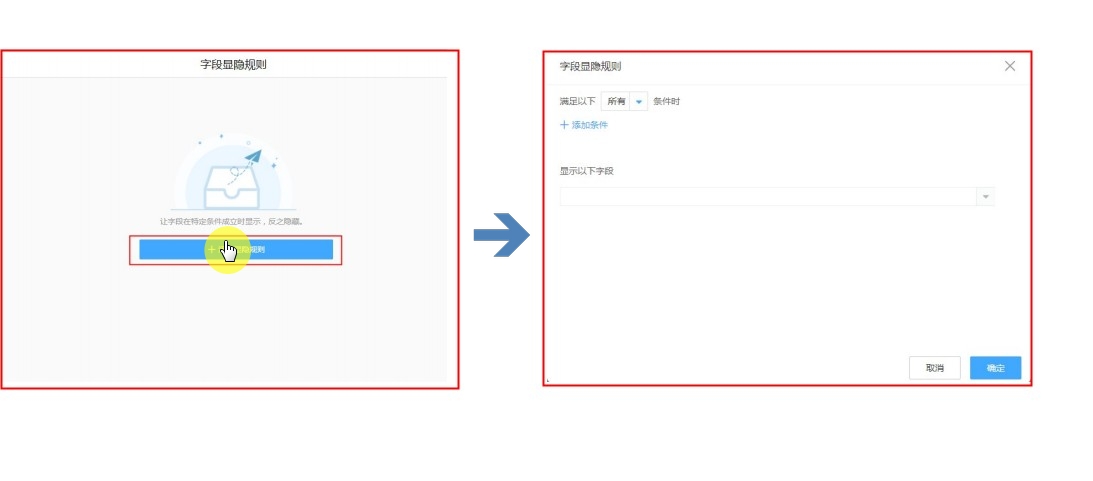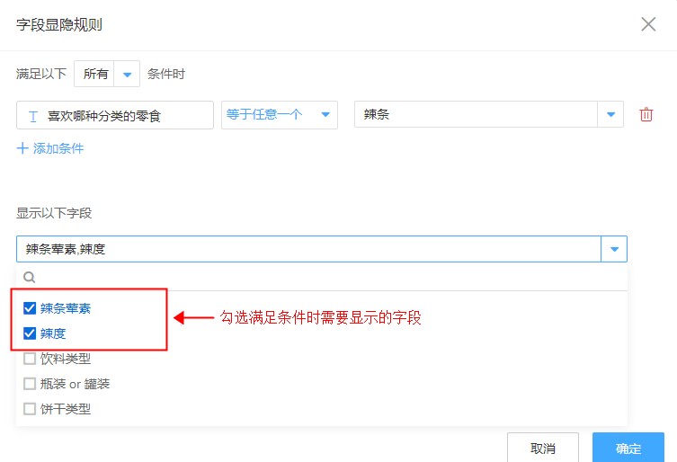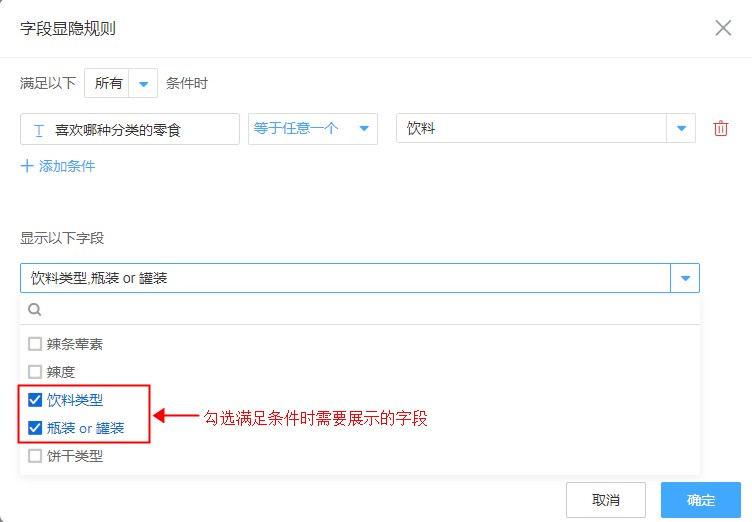 一个字段显隐规则可添加多个条件。多个条件间的逻辑关系可以是满足所有或者满足任意一个。