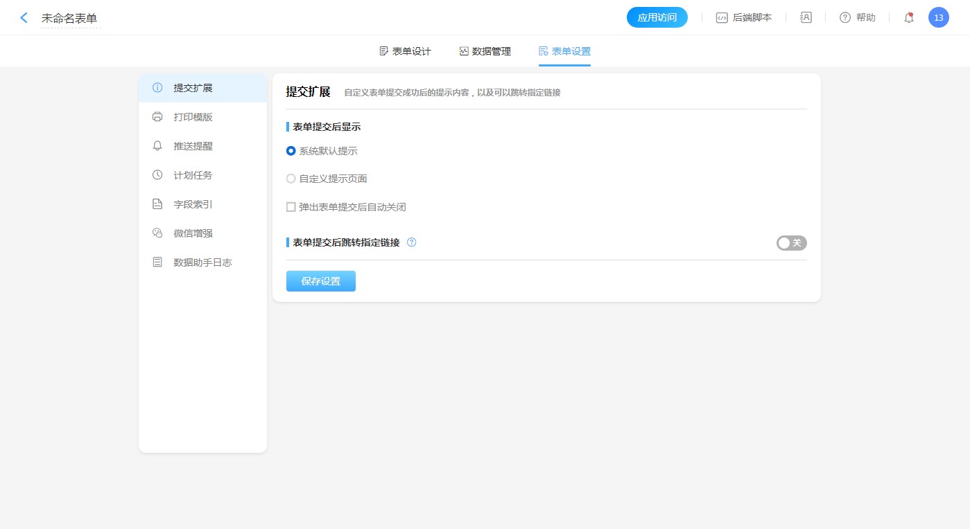 - 步骤:【应用管理】—【表单设计】—【表单设置】