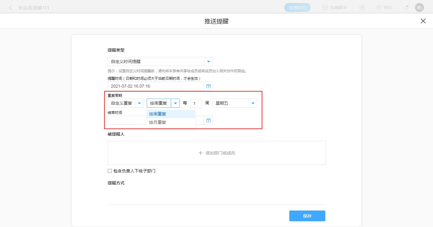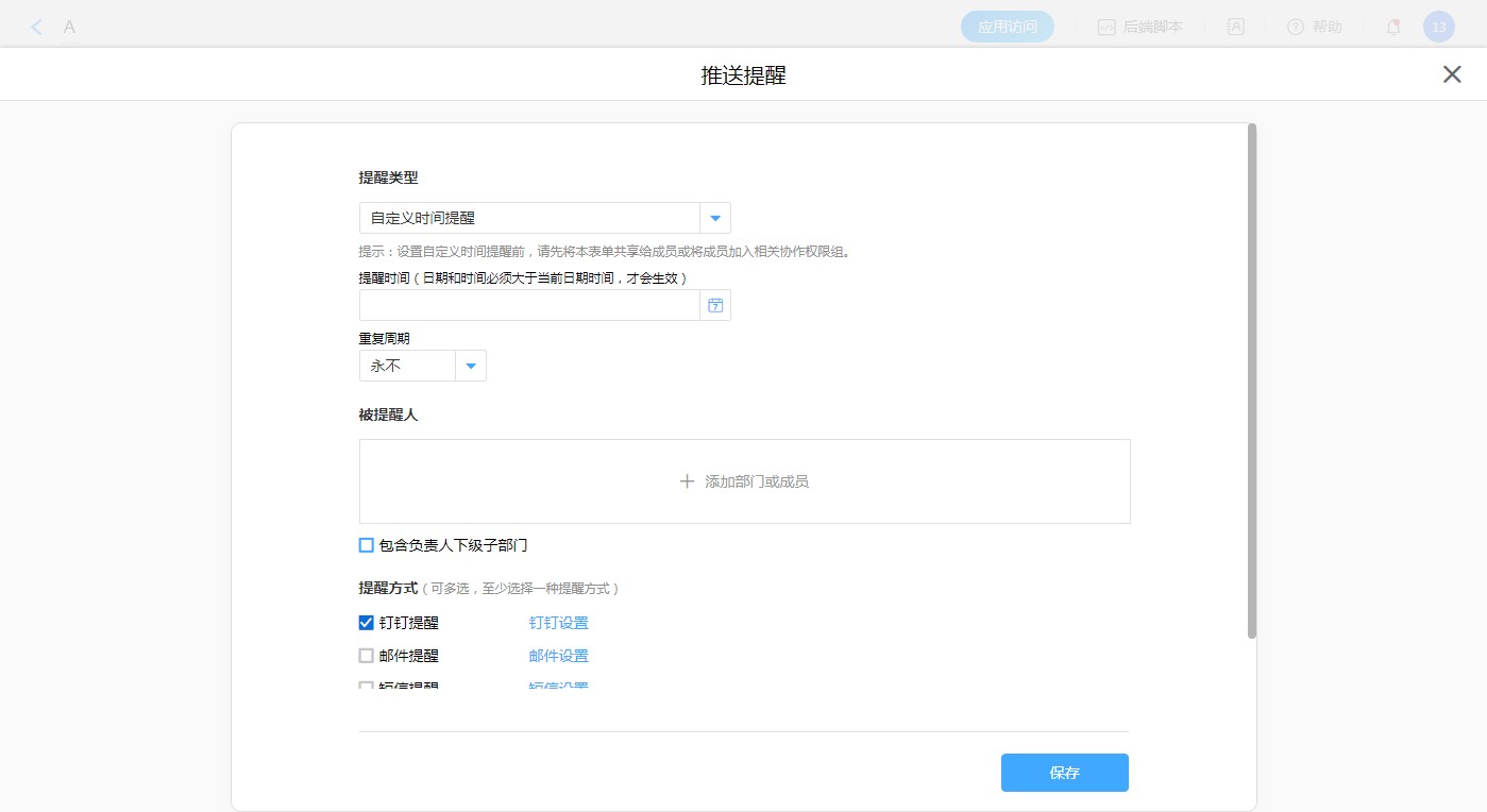 注意:如果是自定义时间提醒,一定要将该表单共享给被提醒人,或者将被提醒人加入数据协作权限组。因为成员收到提醒时,可点击链接直接打开表单,所以至少要在一个权限组内。