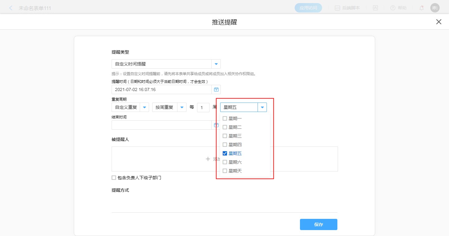 • 在设置自定义时间重复提醒时,支持设置每周哪一天或者哪几天提醒,如员工订餐提醒中,设置工作日的「周一~周五」提醒,周末不提醒。