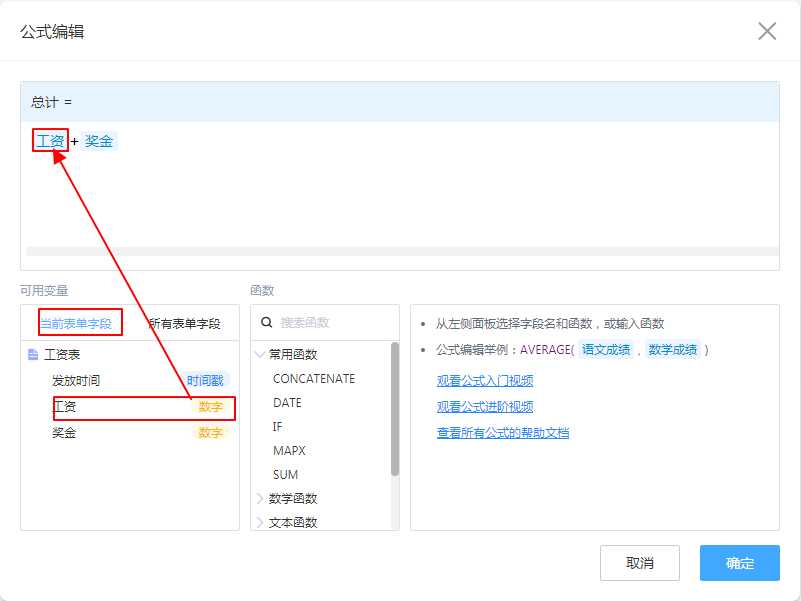 公式面板下方可以选择公式所要用到的字段。一定要从下方选择字段(蓝底),手写或者复制无效。除了MAPX函数之外,其他函数的字段都必须来自当前表单字段。