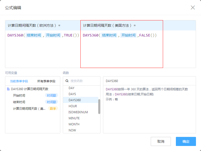 False或省略 美国(NASD)方法,如果起始日期是一个月的最后一天,则等于同月的30号;如果终止日期是一个月的最后一天,并且起始日期早于30号,则终止日期等于下个月的1号,否则,终止日期等于本月的30号。