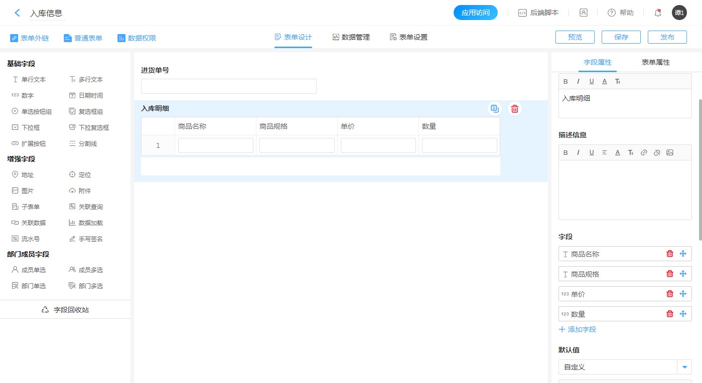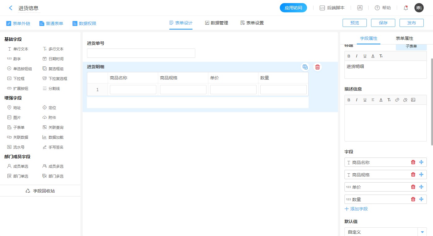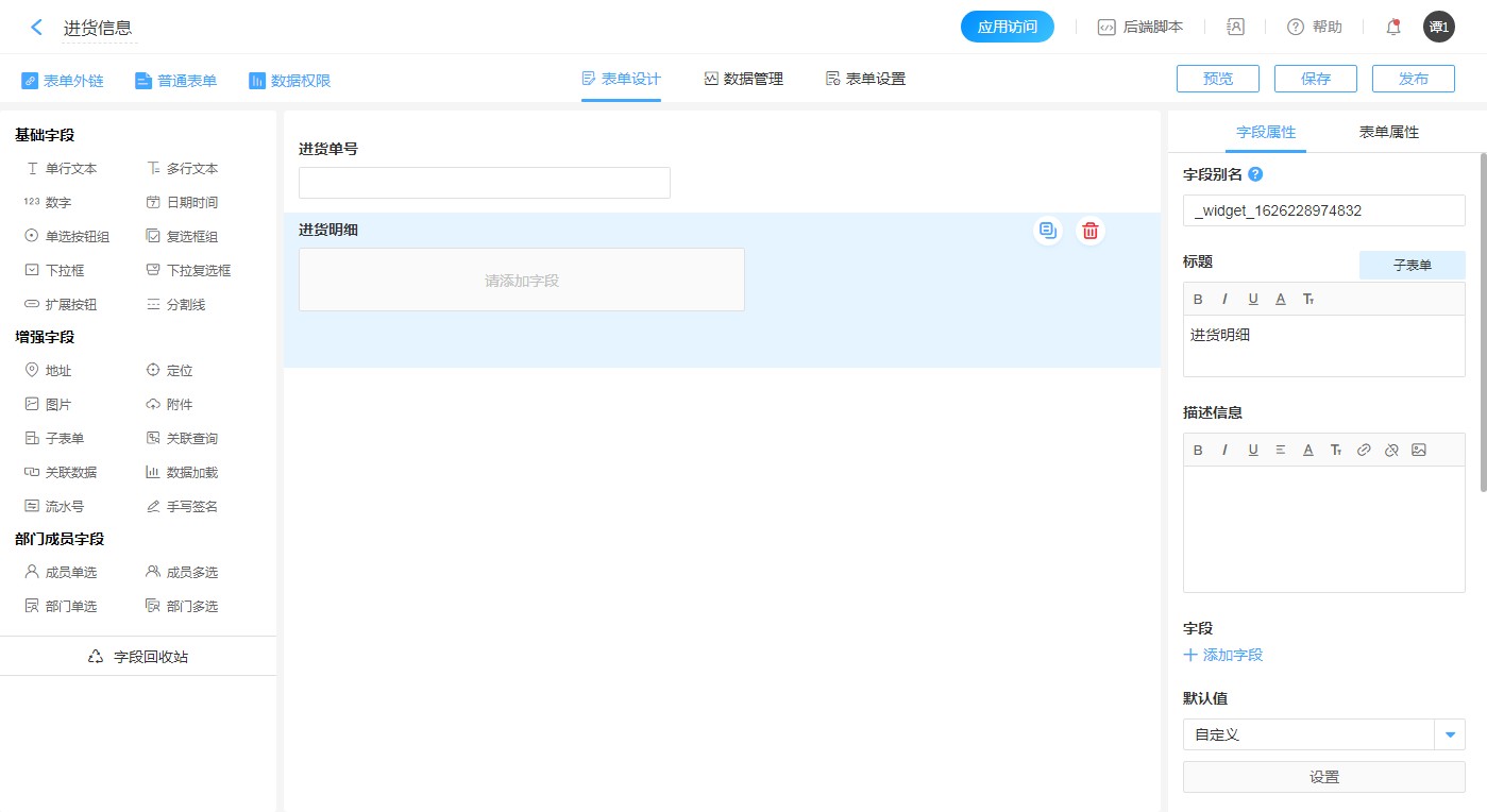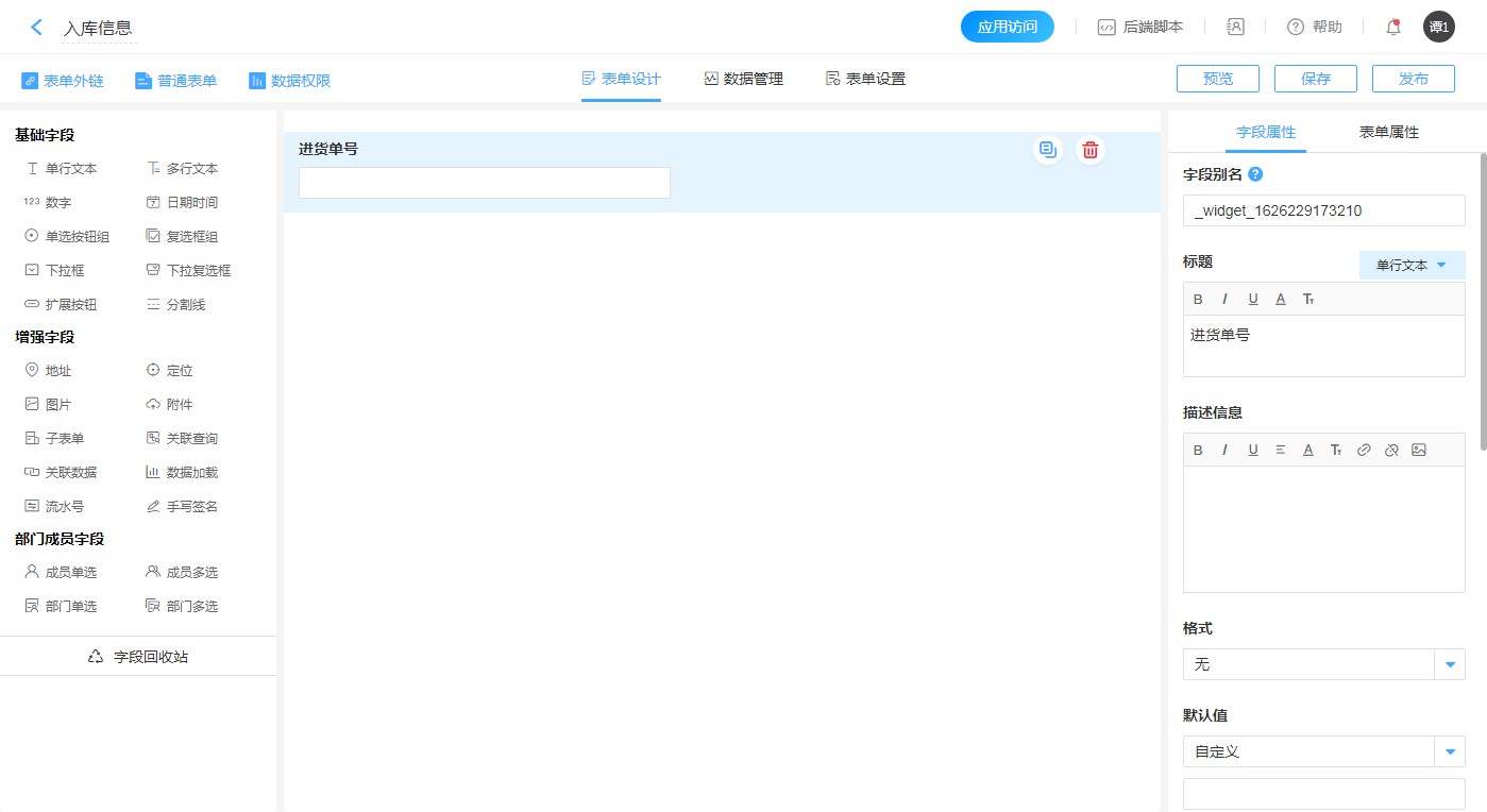 1.创建【进货信息】表单,并添加一个【单行文本】字段,标题为:进货单号。