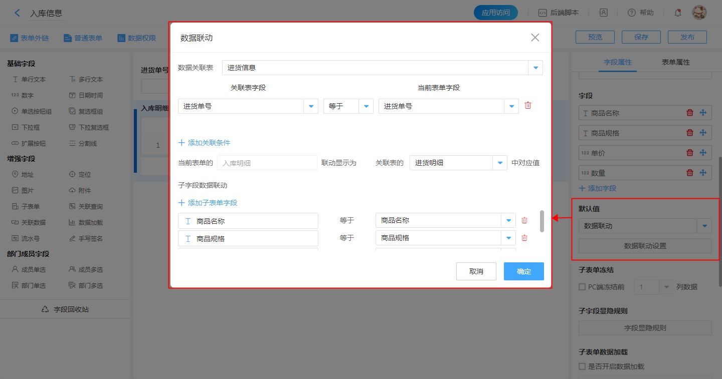7.子表单联动,关联表单为【进货信息】,数据联动【进货信息】里面的“进货明细”中的“商品名称”、“商品规格”、“单价”、“数量”。