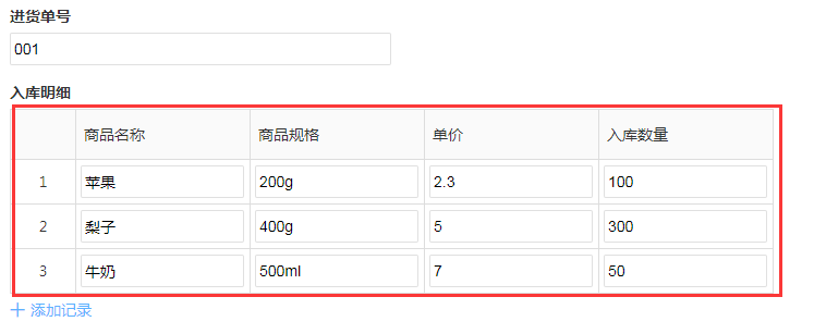 如下图:当前表单【进货单号】与进货信息表单的【进货单号】一致,获取这一单号的进货明细信息。