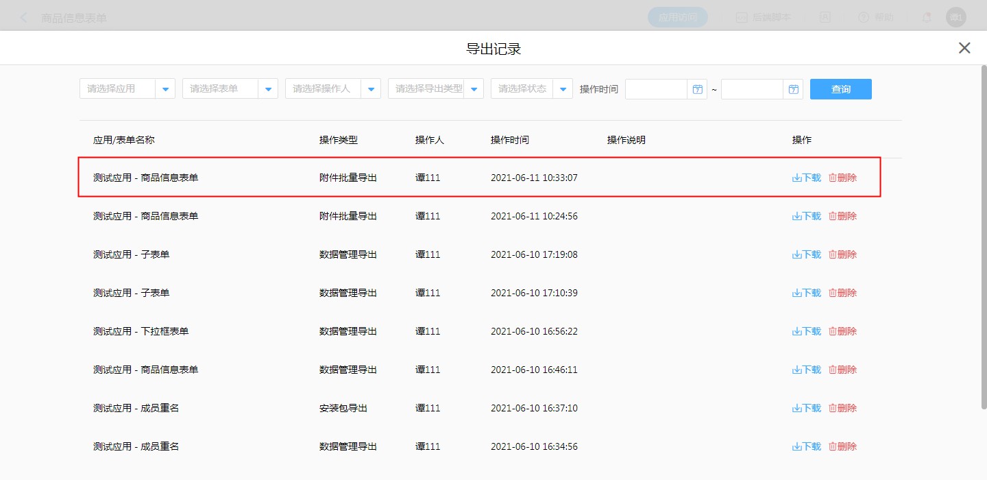 包含「附件字段」「图片字段」的表单,可以通过批量导出附件功能一次性下载数据中包含的附件。