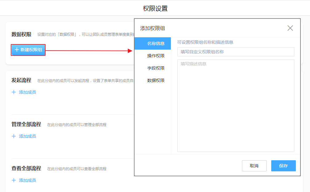 权限组名称 操作权限 字段权限 权限范围 备注
