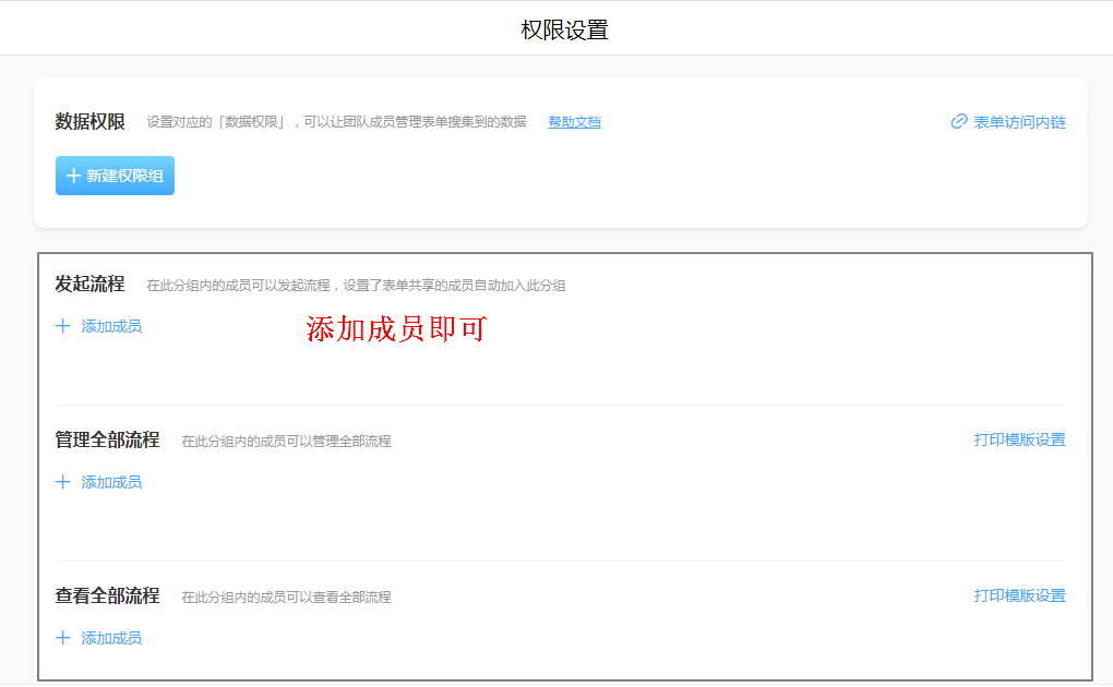 流程表单的数据操作权限有添加、查看、编辑、打印等,更多的操作在于流程操作,如:调整流程负责人、激活或结束流程以及动态和评论等。
