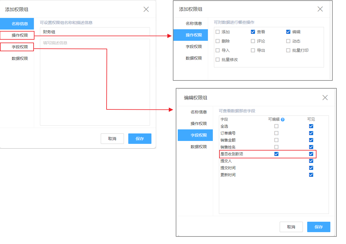 • 对所有字段都可见;但只能编辑【是否收到款项】。