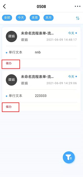 设置了以后,流程发起人即可在访问应用时在「我发起的」流程里找到需要催办的流程进行催办提醒。