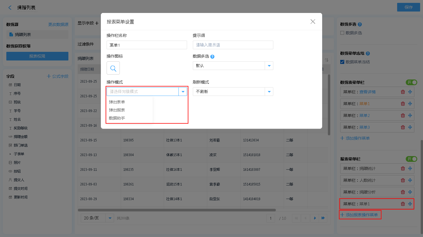 数据表菜单 支持 弹出表单、弹出报表、数据助手、功能插件