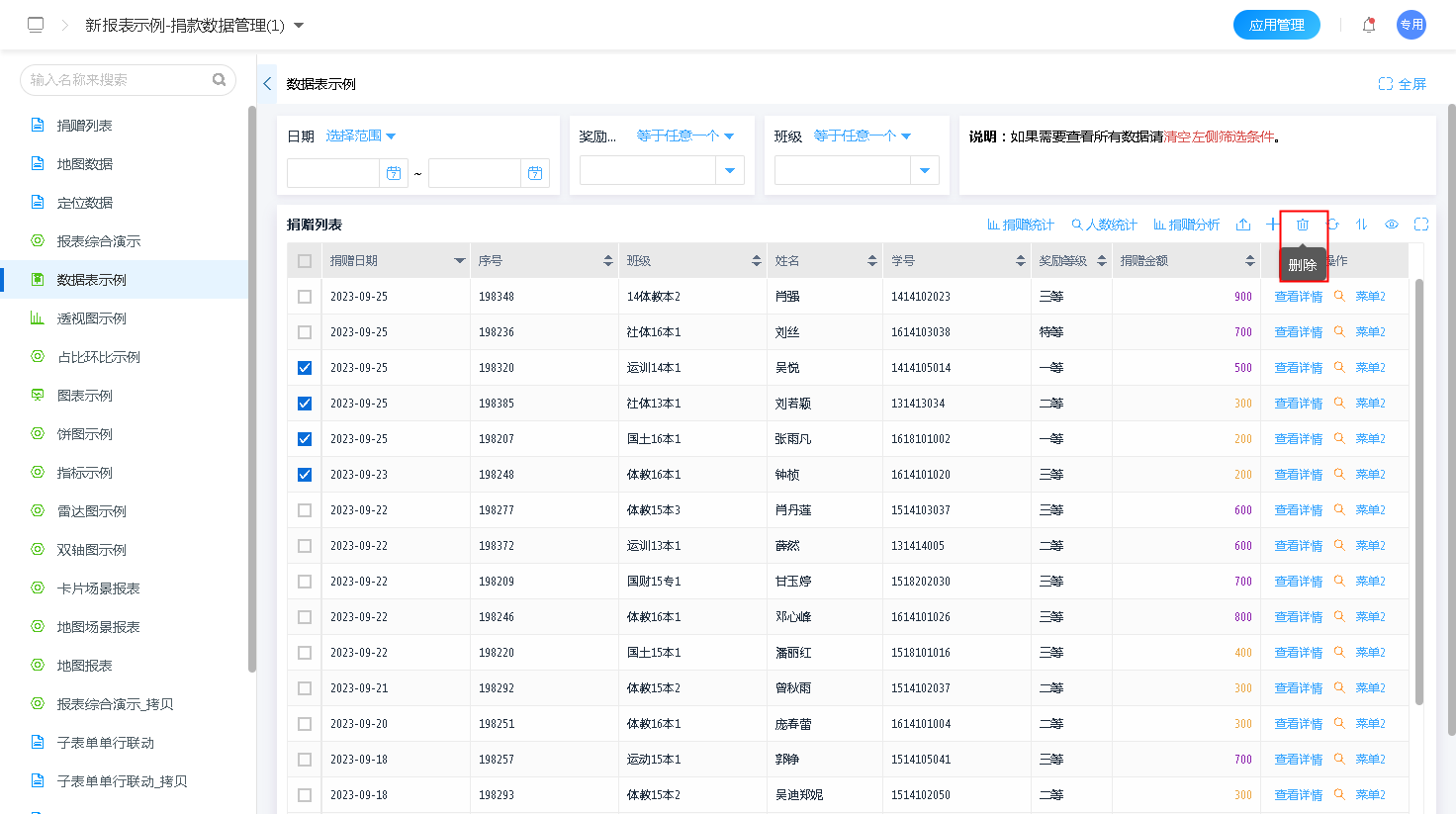 开启数据多选后,在操作报表时,可以选择多条数据,并做出对应的操作,如:批量删除等;