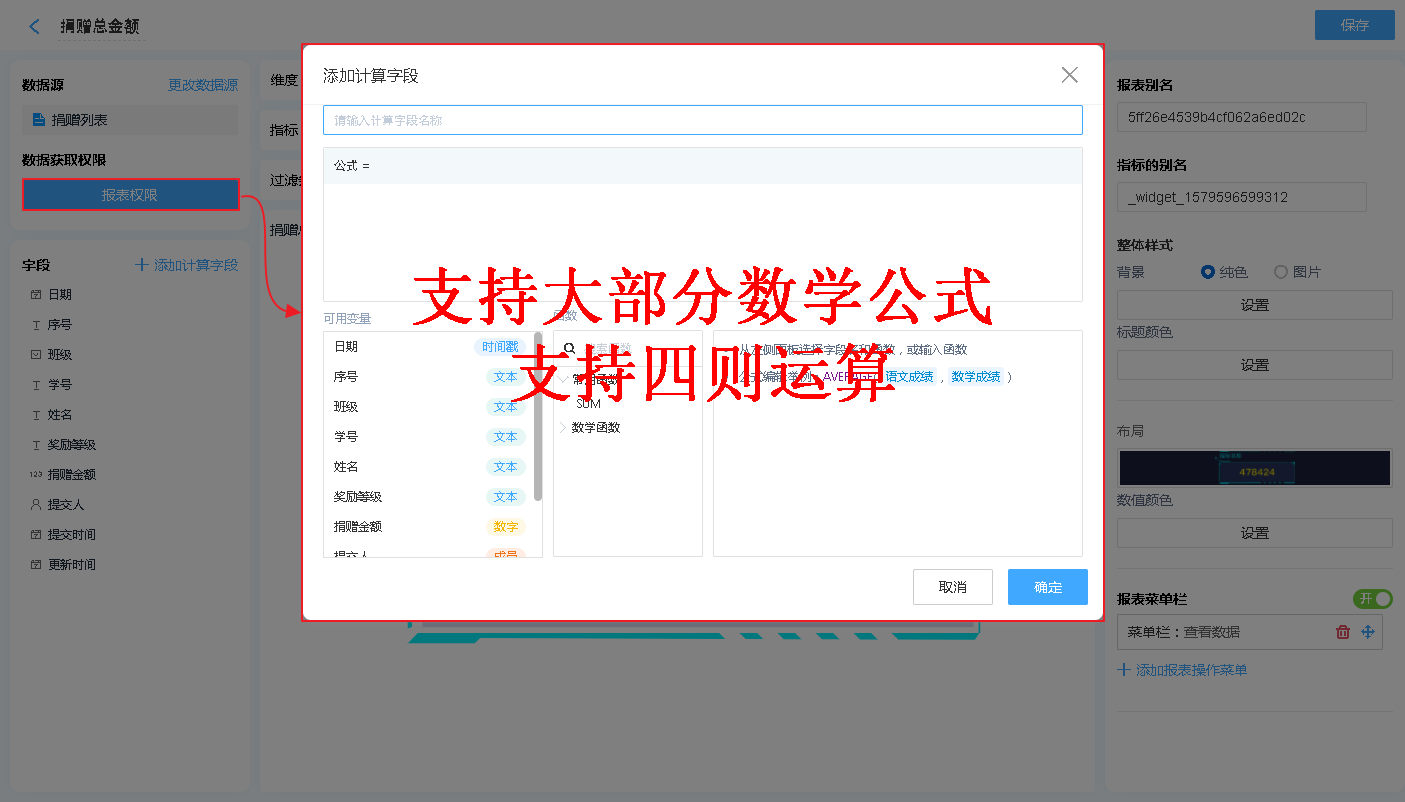 也可以通过增加公式字段,对报表中显示的内容进行简单的计算处理【支持绝大多数数学函数及+-*/四则运算】。
