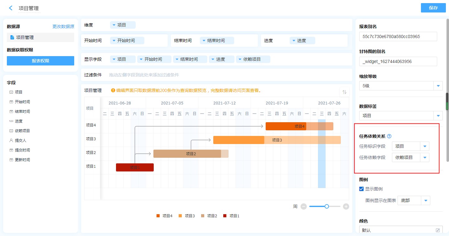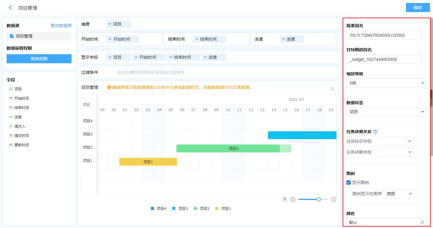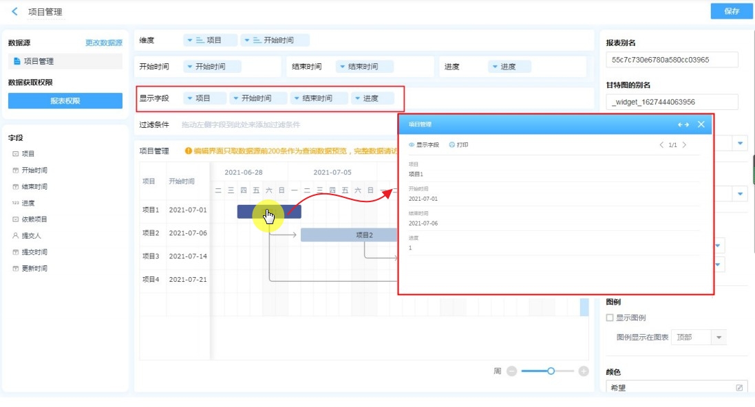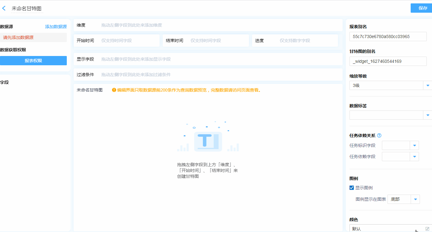 甘特图的设计区分为 维度、开始时间&结束时间、进度、显示字段、过滤条件以及数据显示区。