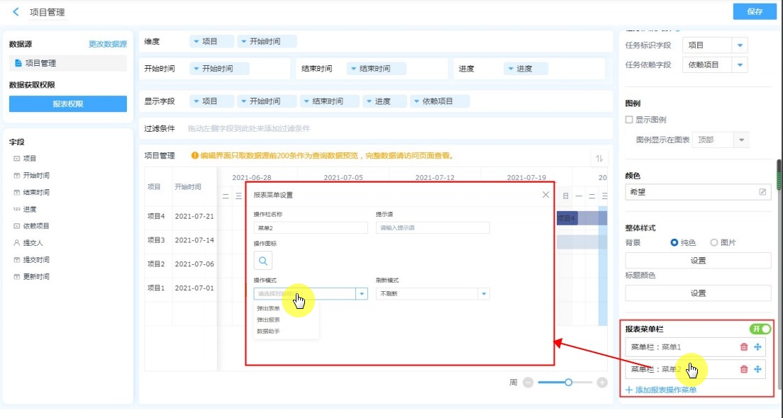 报表菜单 支持 弹出表单、弹出报表、数据助手: