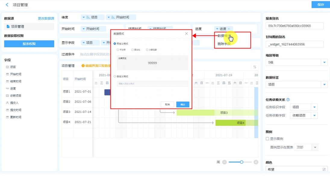 • 修改显示名:字段添加到维度区域后,可自行修改其在甘特图中的表头文字。