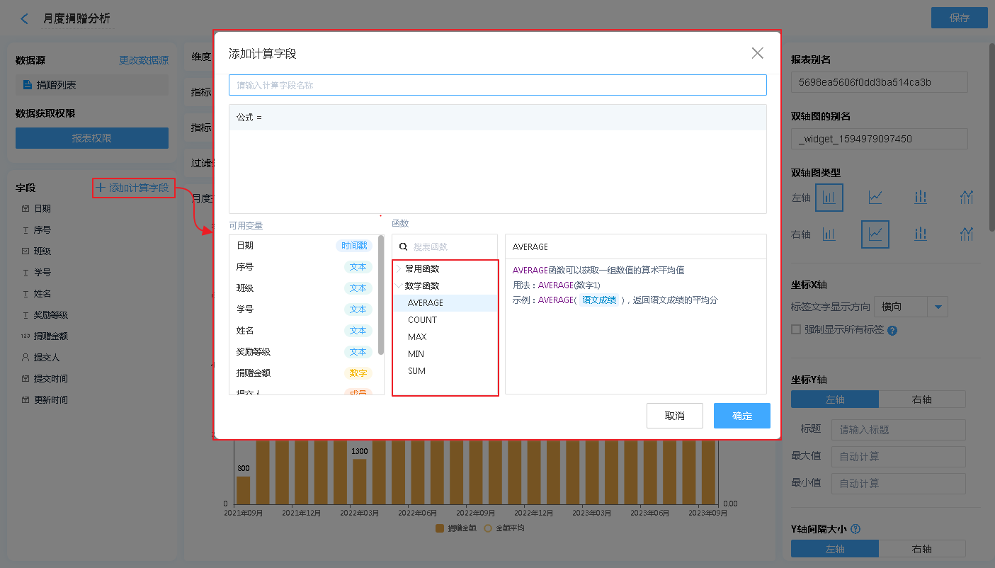 也可以通过增加公式字段,对报表中显示的内容进行简单的计算处理【支持绝大多数数学函数及+-*/四则运算】。