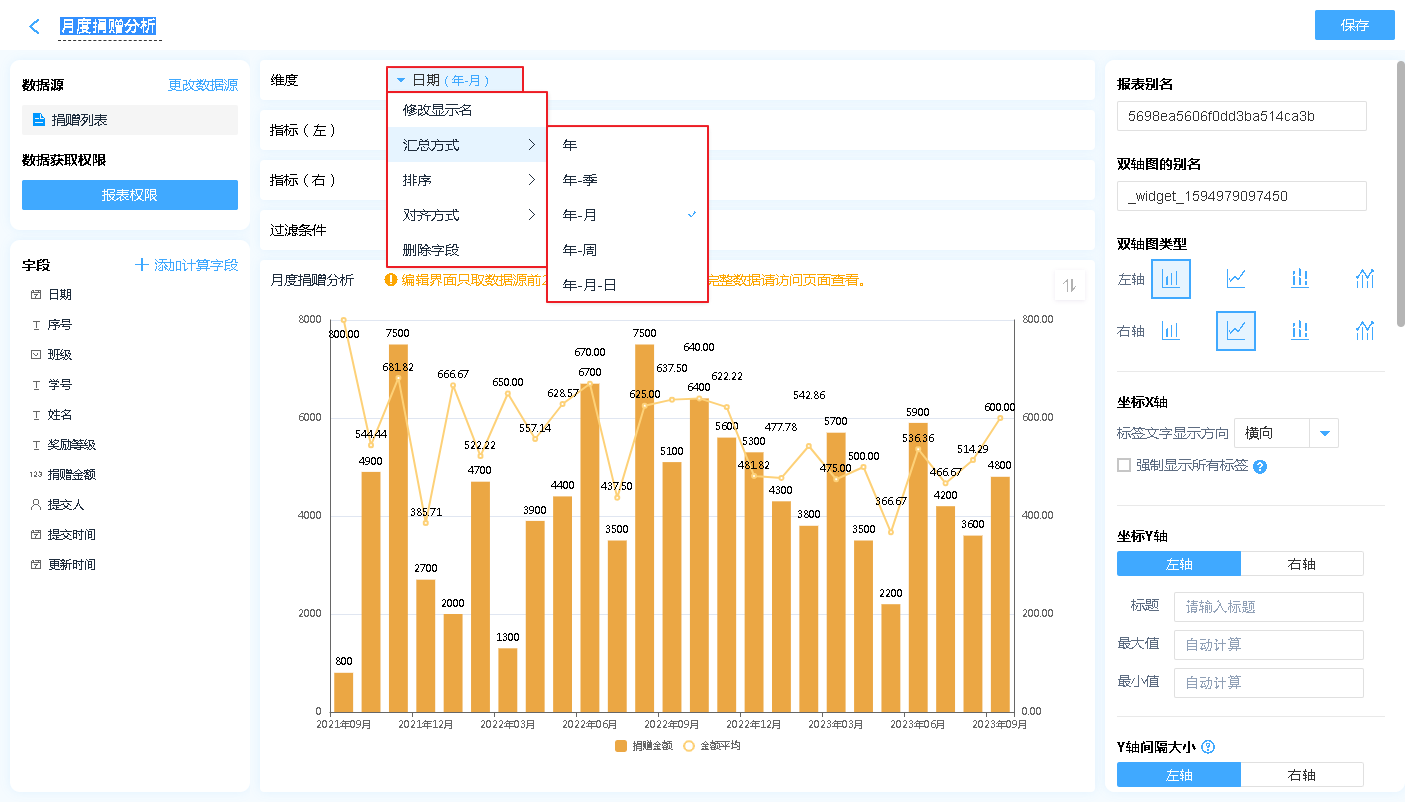 • 汇总方式: 仅日期时间字段可设置,可以设置按照何种日期格式对数据进行汇总(如:按年、按季度、按月汇总)
