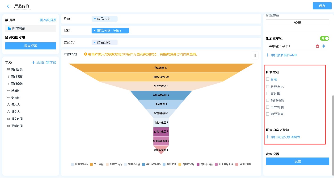 漏斗图支持和其他表单联动,联动目标支持同数据源的任何报表。主联动表中选择某个字段或某个数据,被联动表中会出现与之相应的数据。