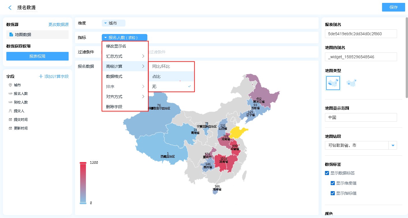 • 显示维度值:在地图上对应的区域显示维度的内容,一般情况下是省/市/县区信息。