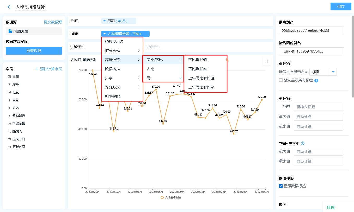 显示名称: 字段添加进入显示字段区域后,可自行修改其在折线图中的表头文字汇总方式: 指标的汇总方式仅支持数字字段,非数字字段在拖入指标中,汇总方式只有计数一项。高级计算:高级计算可进行同环比、占比的计算,详见同环比和占比。数据格式:可通过数据格式的设计,在报表中显示自己想要的格式,详见数据格式详解。排序:支持按照指定的格式对折线图内的数据进行排序[默认为数据创建时间]对齐方式:支持报表单元格文字的排列方式删除字段:此处的删除字段,是指从指标中删除,删除后仍可重新添加,不会对原表造成任何影响。