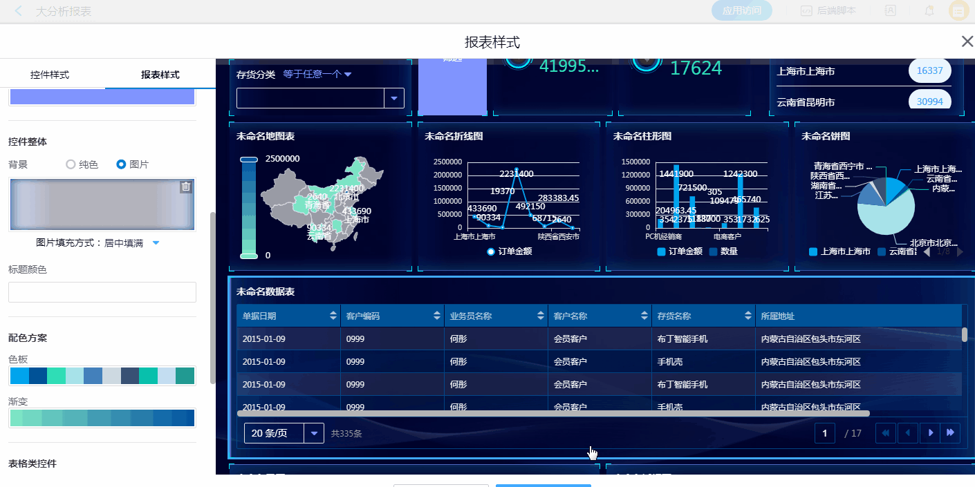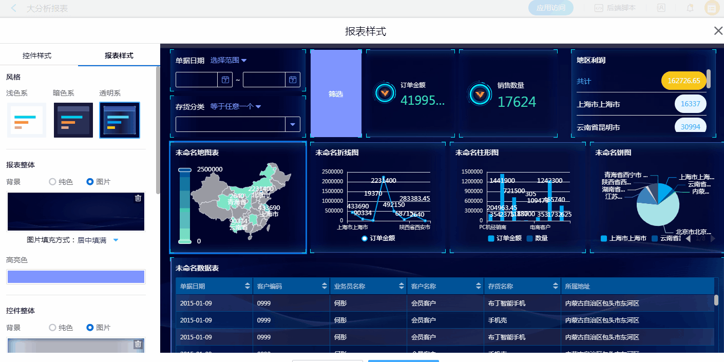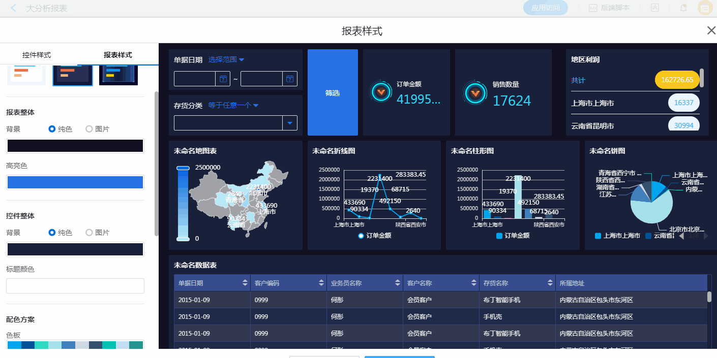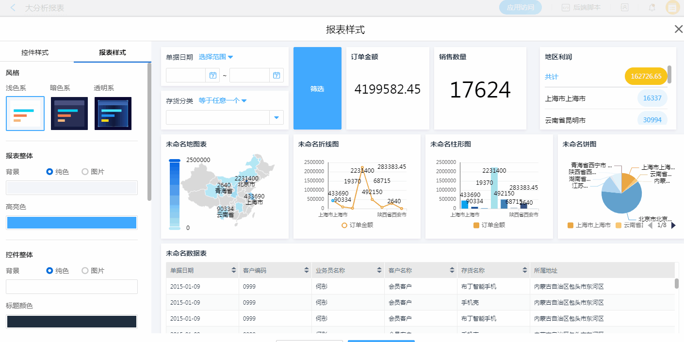 通过报表样式的设置,可快速完整报表整体风格的转换。同时,也可以对报表中某一图表的样式进行风格设置,优化视觉效果。