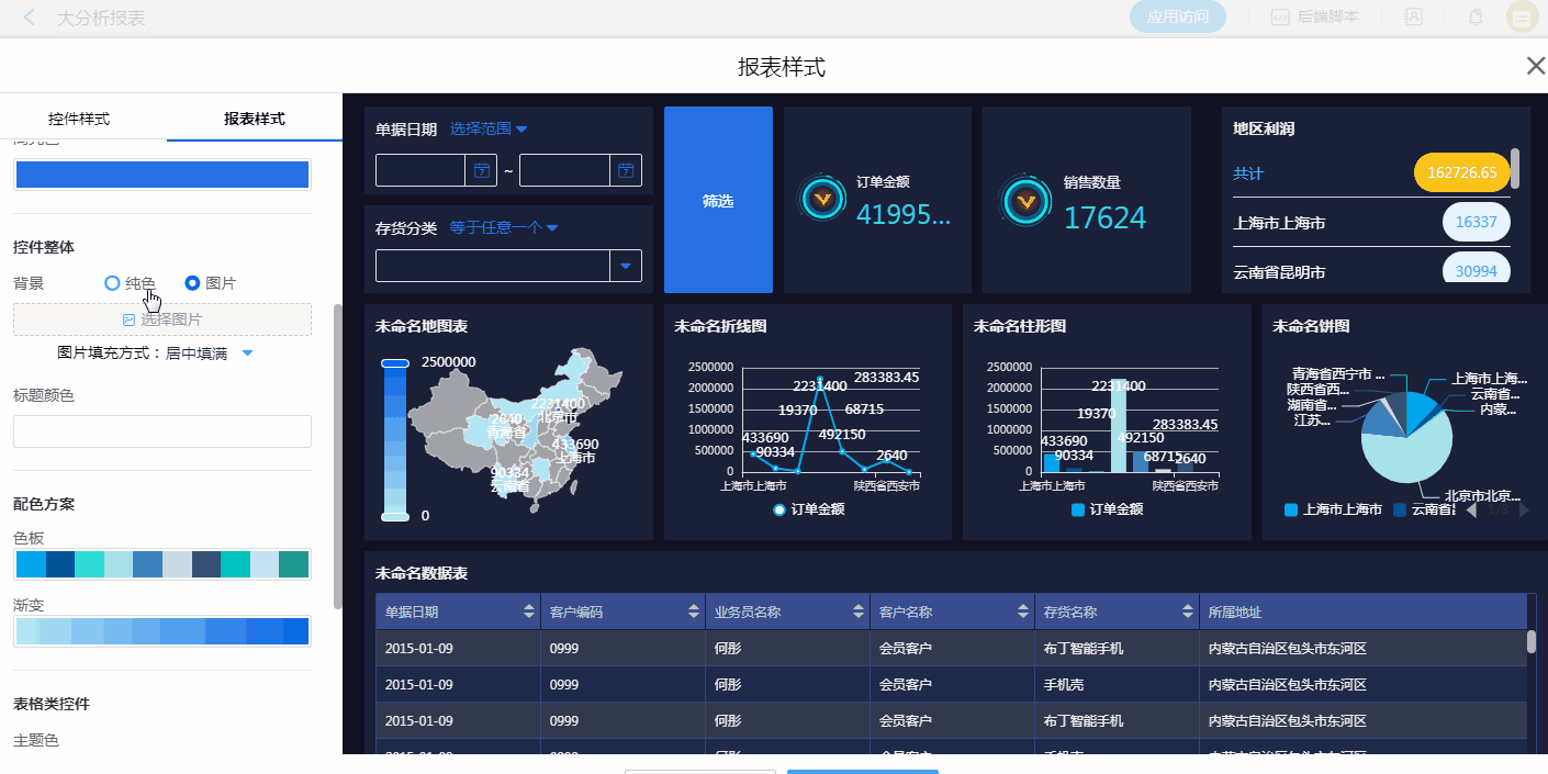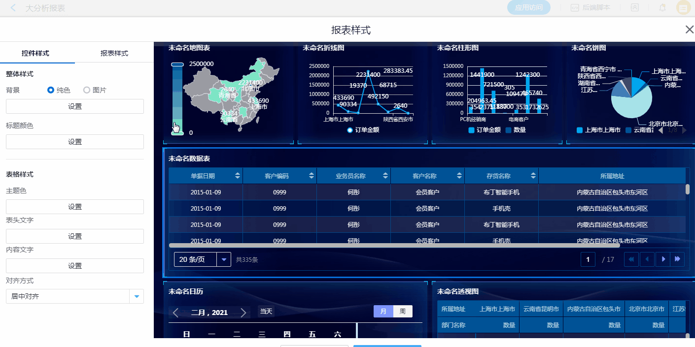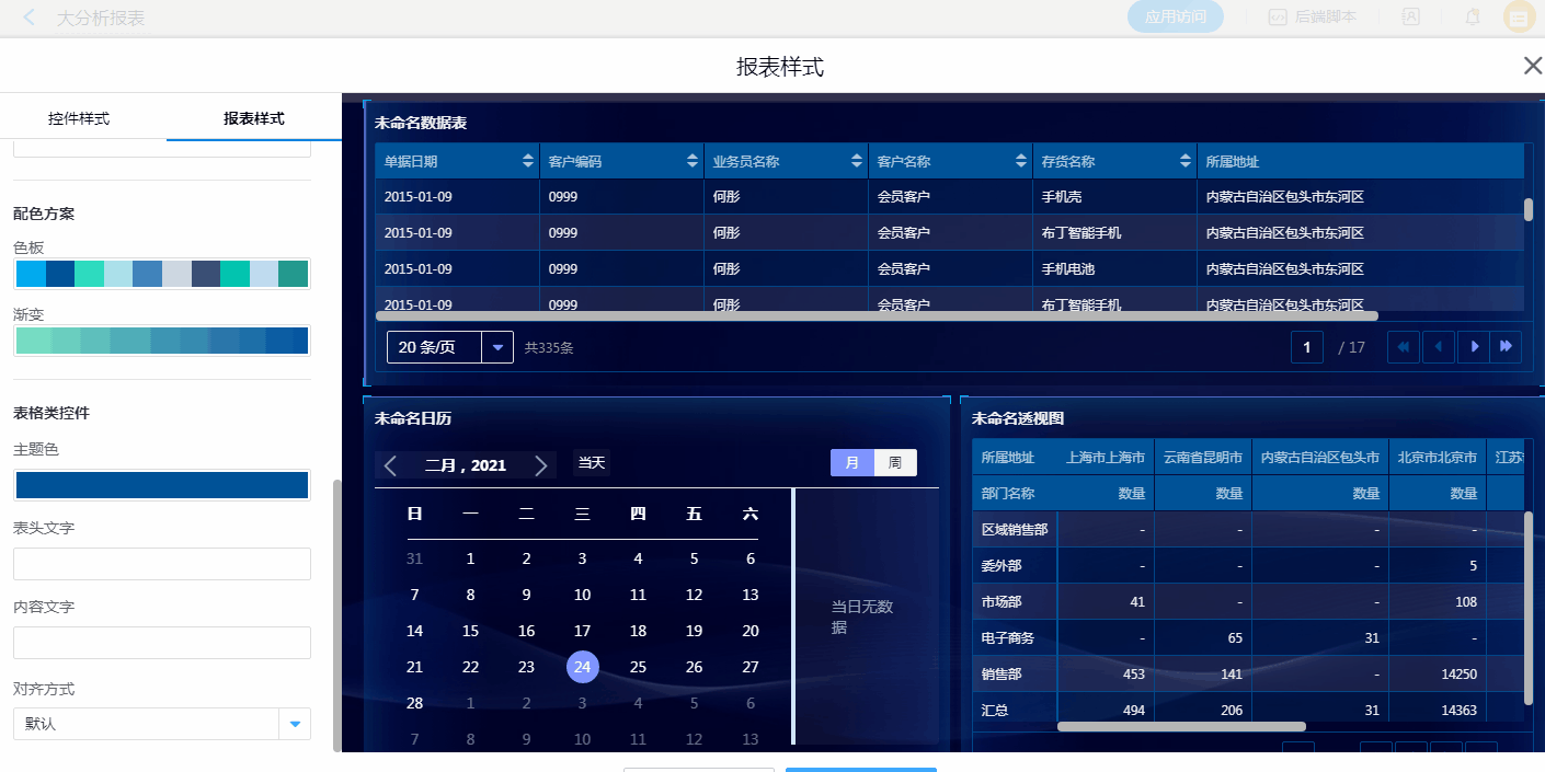 数据表、透视图、后端表:整体样式(背景、标题颜色)、表格类控件(主题色、表头文字、内容文字、对齐方式)