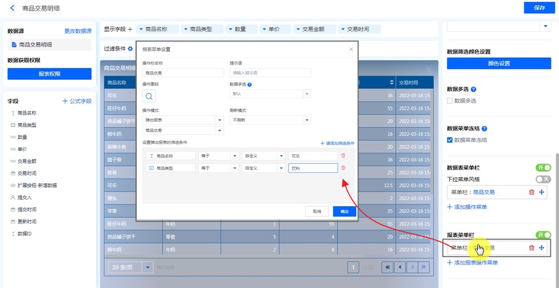 第一步:【目标报表的编辑页面】——【报表菜单栏】——【添加操作菜单】,配置相关属性,操作模式选择【弹出表单】并选择表单,添加筛选条件,保存。